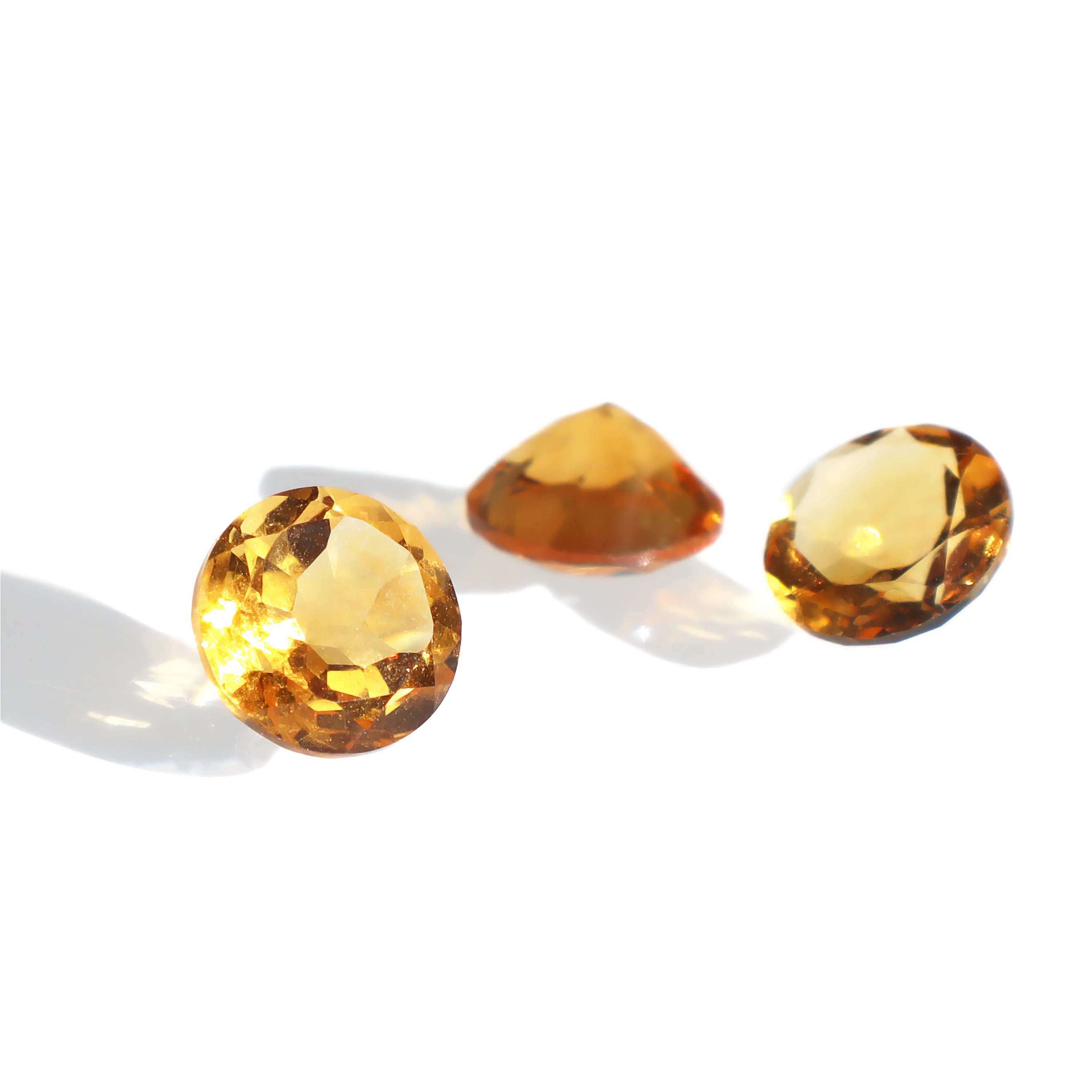 A calibrated selection of round faceted citrine gemstones, featuring fascinating shades of golden sunset and yellowish-orange. Perfect for use in bespoke designs and fine jewellery.