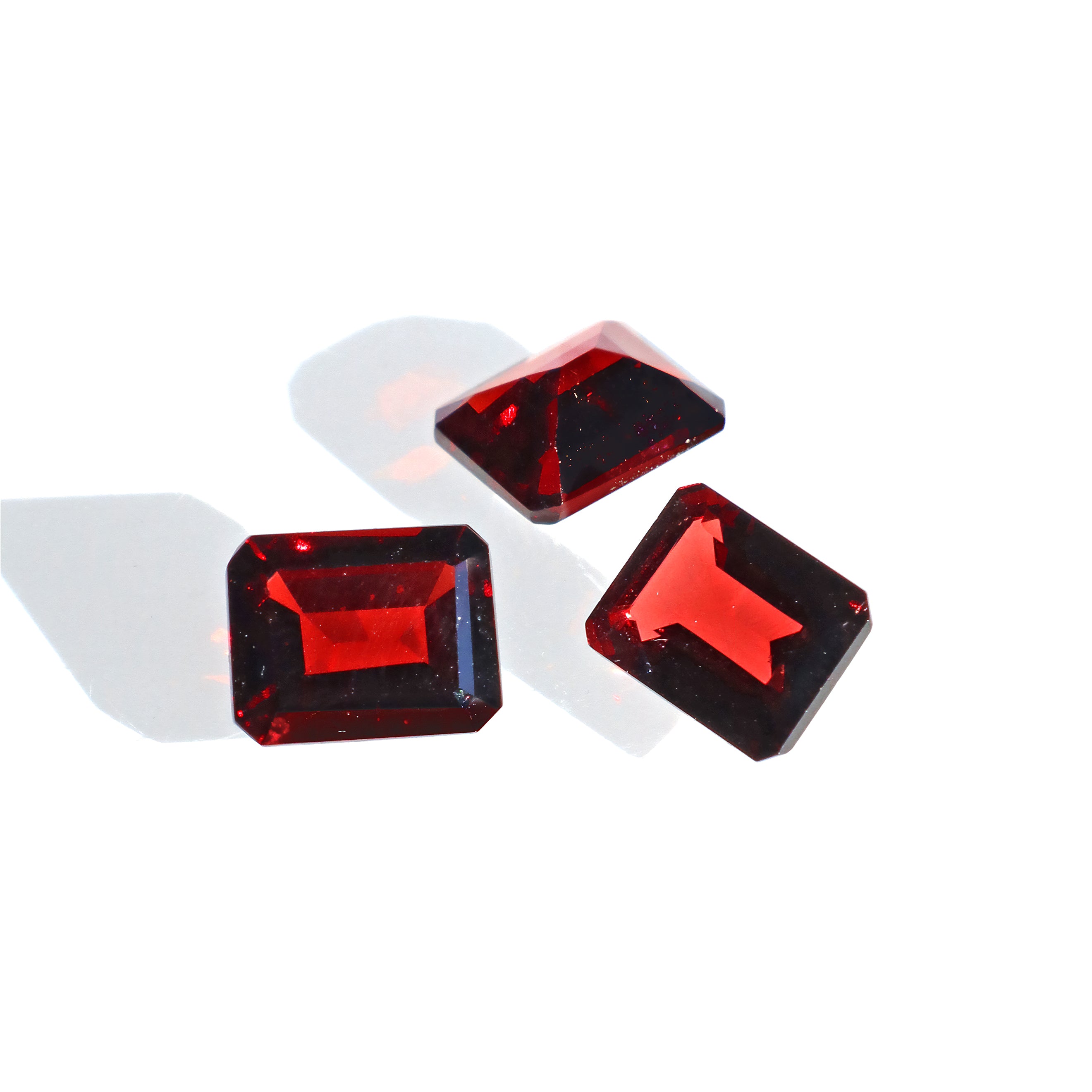 A calibrated selection of octagonal faceted red garnet gemstones, all displaying rich, deep blood-red colour tones. Perfect for use in bespoke designs and fine jewellery.