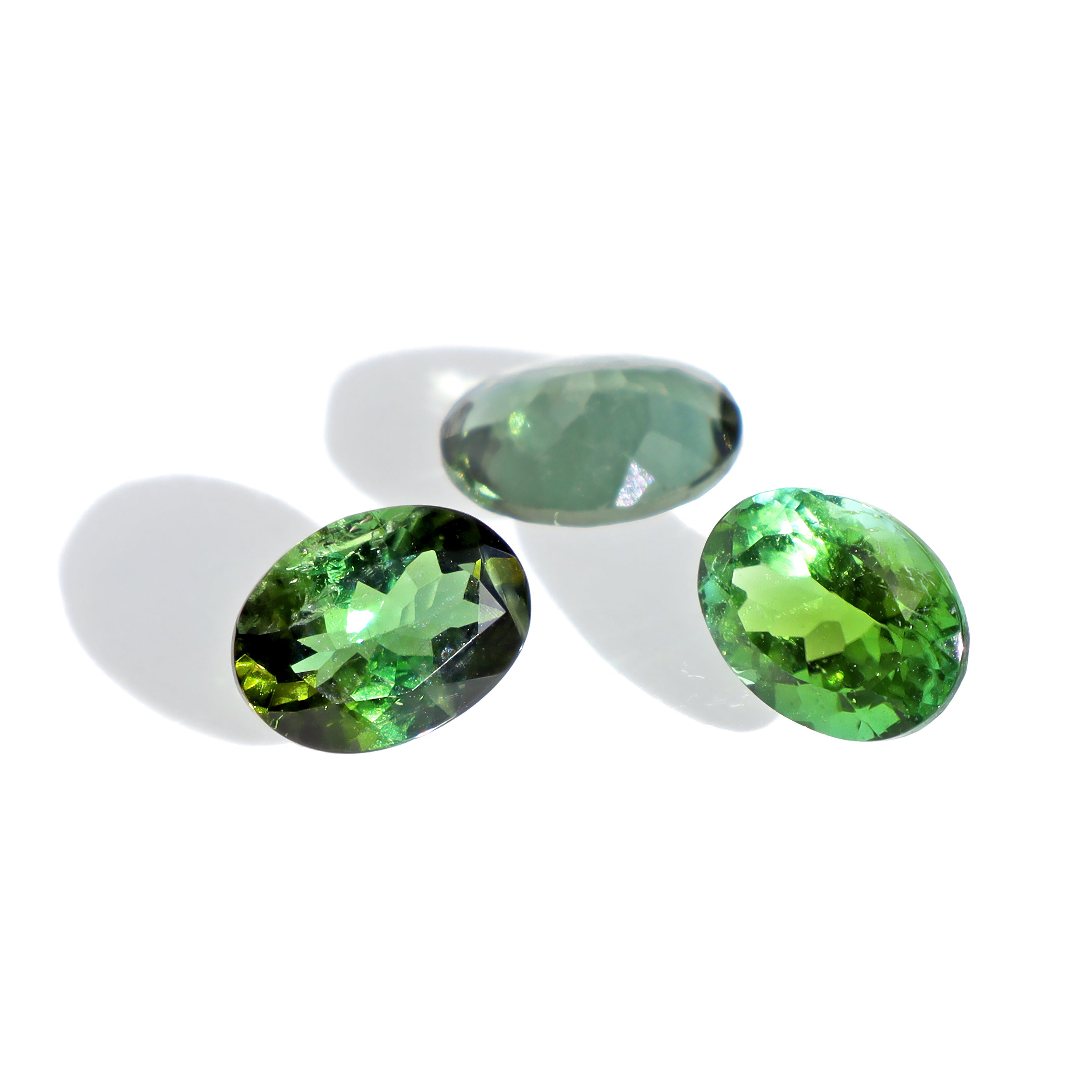 A calibrated selection of oval faceted natural green tourmaline gemstones. As tourmaline stones vary dramatically in terms of the exact shade, all of our stones can range between a light golden-green to a much richer forest-green colour.