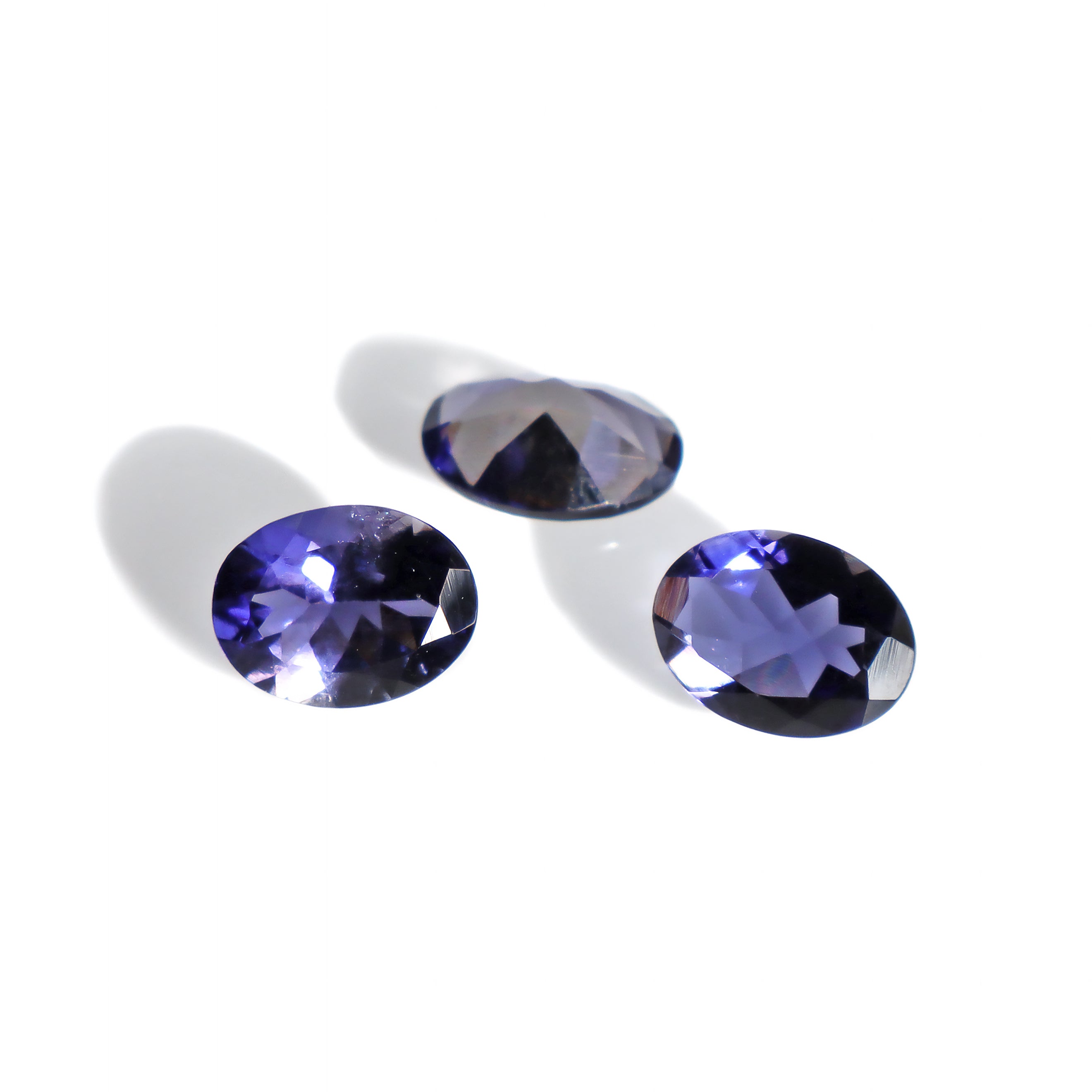 A calibrated selection of oval faceted pleochroistic iolite gemstones. Mostly gorgeous shades of dark violet blue, their natural pleochroism allows the viewer to catch glimpses of blue-grey or even total colourlessness when viewing the stone at certain angles with the naked eye.