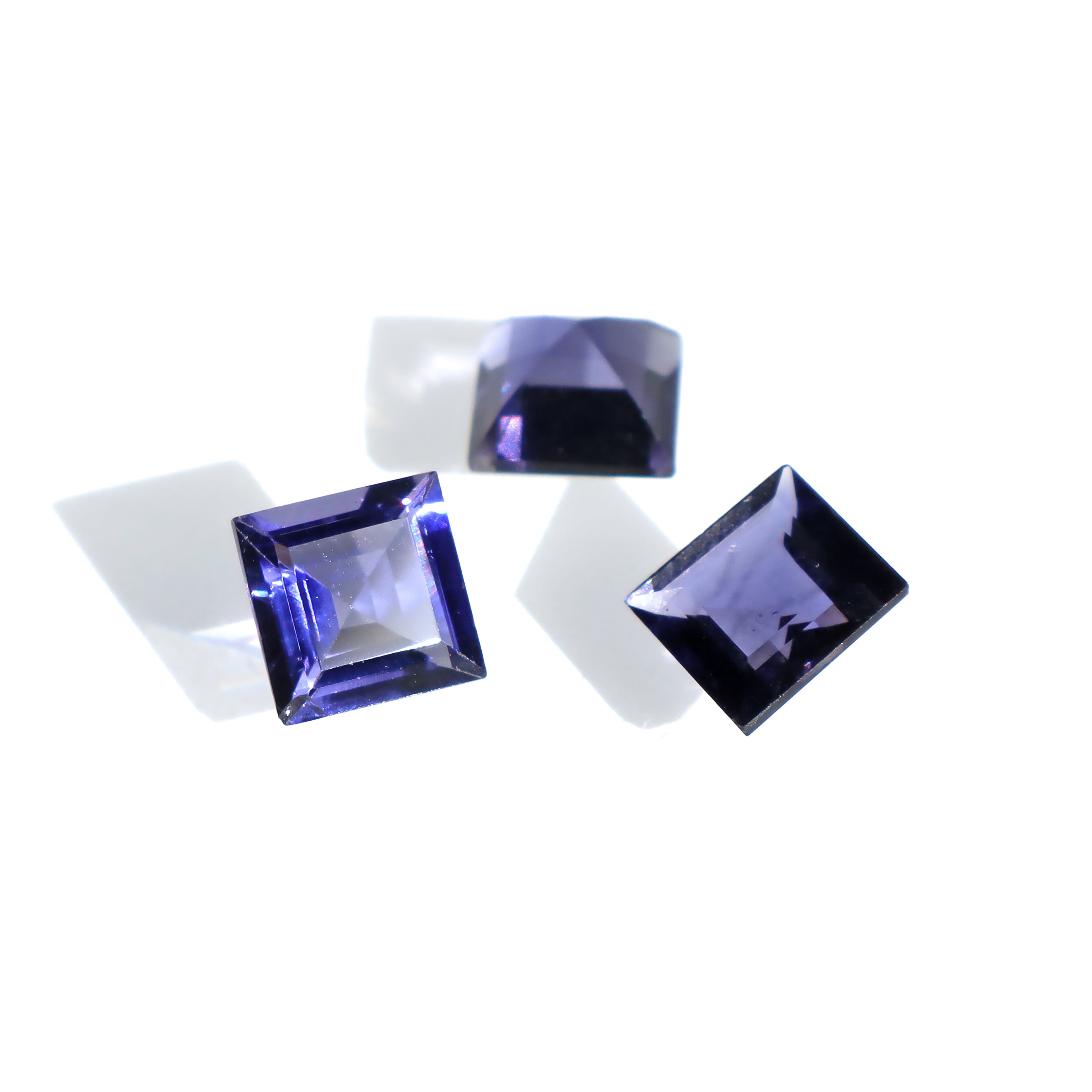 A calibrated selection of square faceted pleochroistic iolite gemstones. Mostly gorgeous shades of dark violet blue, their natural pleochroism allows the viewer to catch glimpses of blue-grey or even total colourlessness when viewing the stone at certain angles with the naked eye.