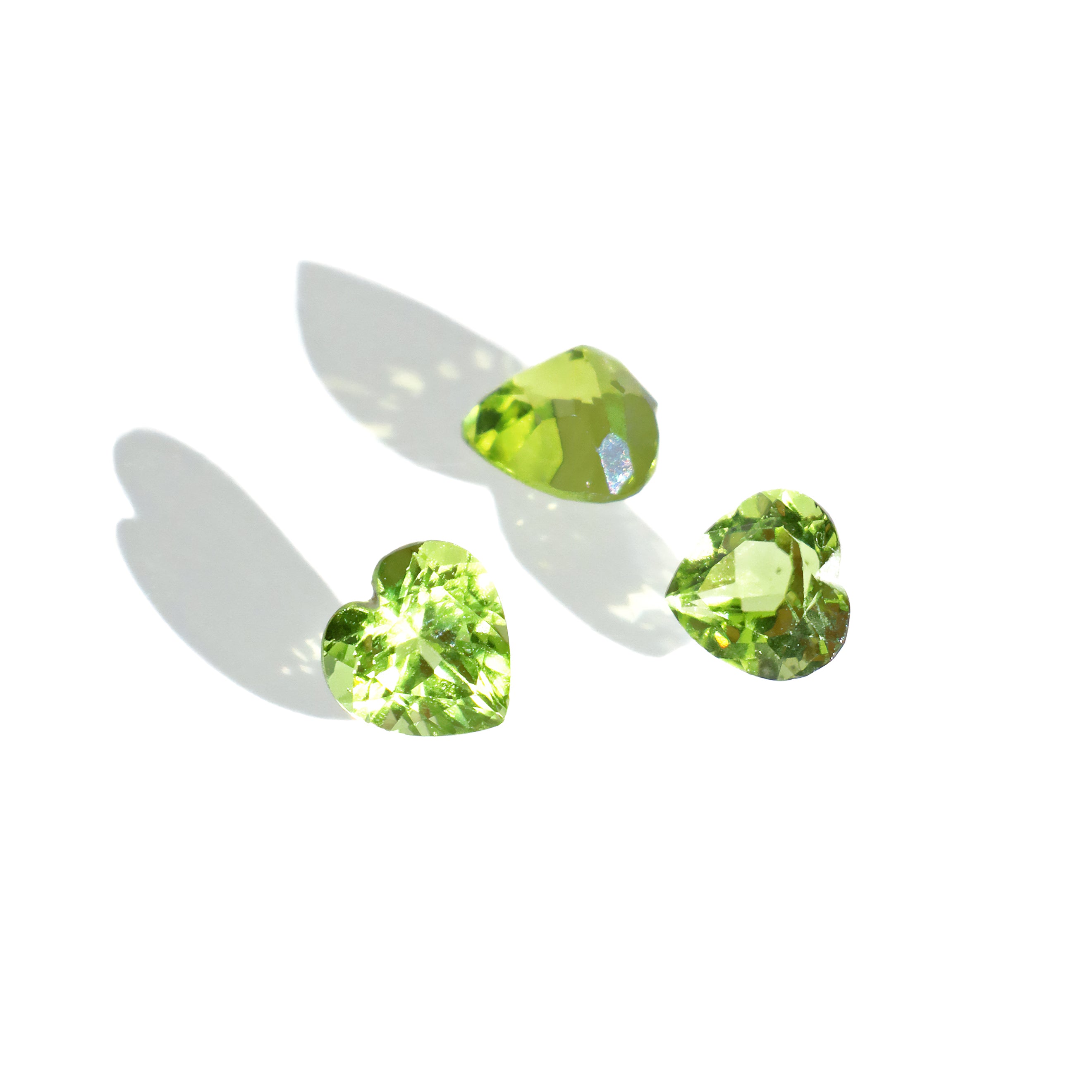 A calibrated selection of heart faceted peridot gemstones, all displaying bright and playful hues of warm, yellowish grass-green. Perfect for use in bespoke designs and fine jewellery.