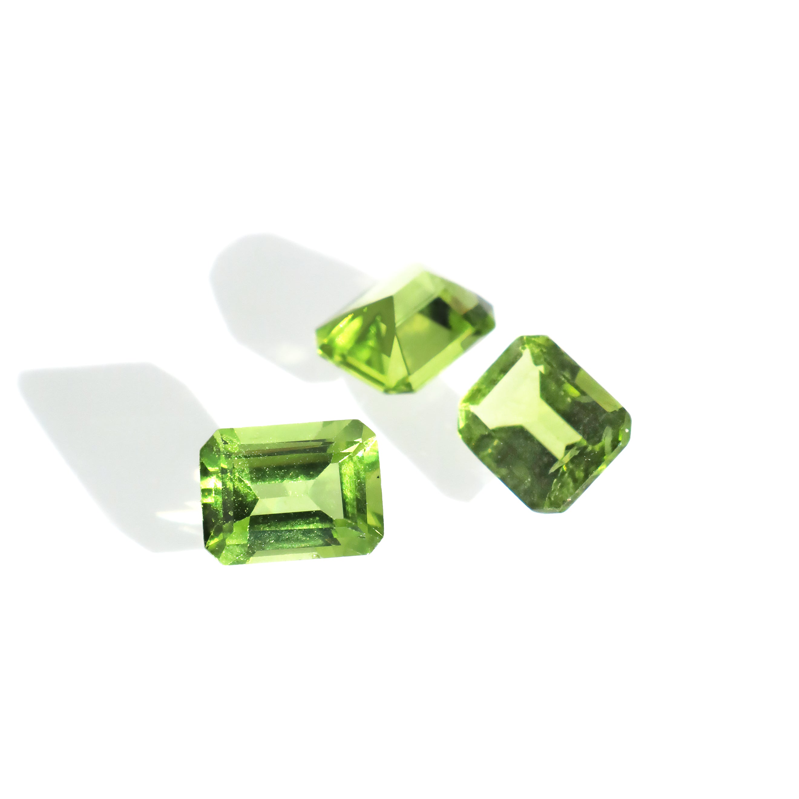A calibrated selection of octagonal faceted peridot gemstones, all displaying bright and playful hues of warm, yellowish grass-green. Perfect for use in bespoke designs and fine jewellery.