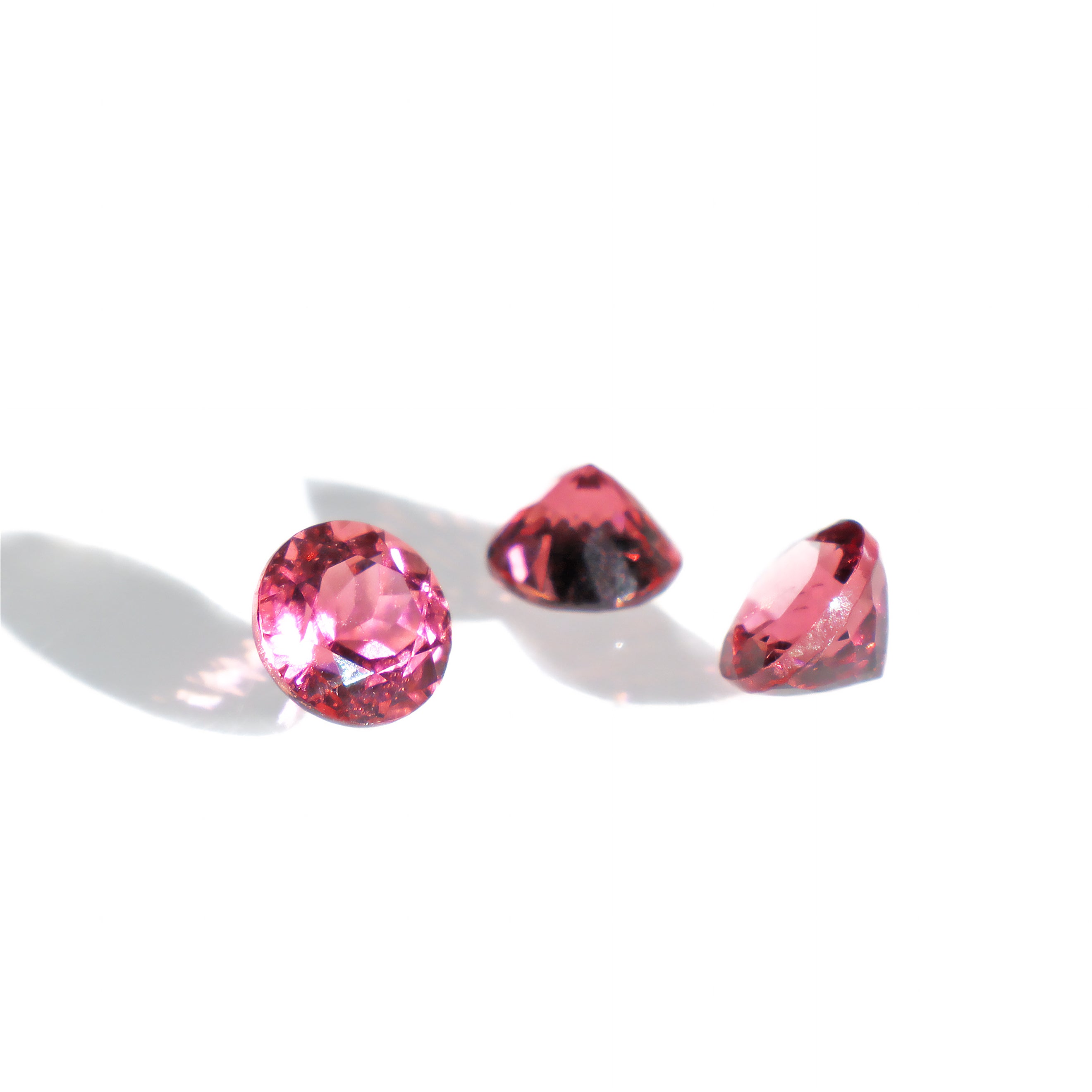 A calibrated selection of round faceted natural pink tourmaline gemstones. As tourmaline stones vary dramatically in terms of the exact shade, all of our stones can range between a deep, rhodalite-like purple-red to a light and bright classic pink colour.