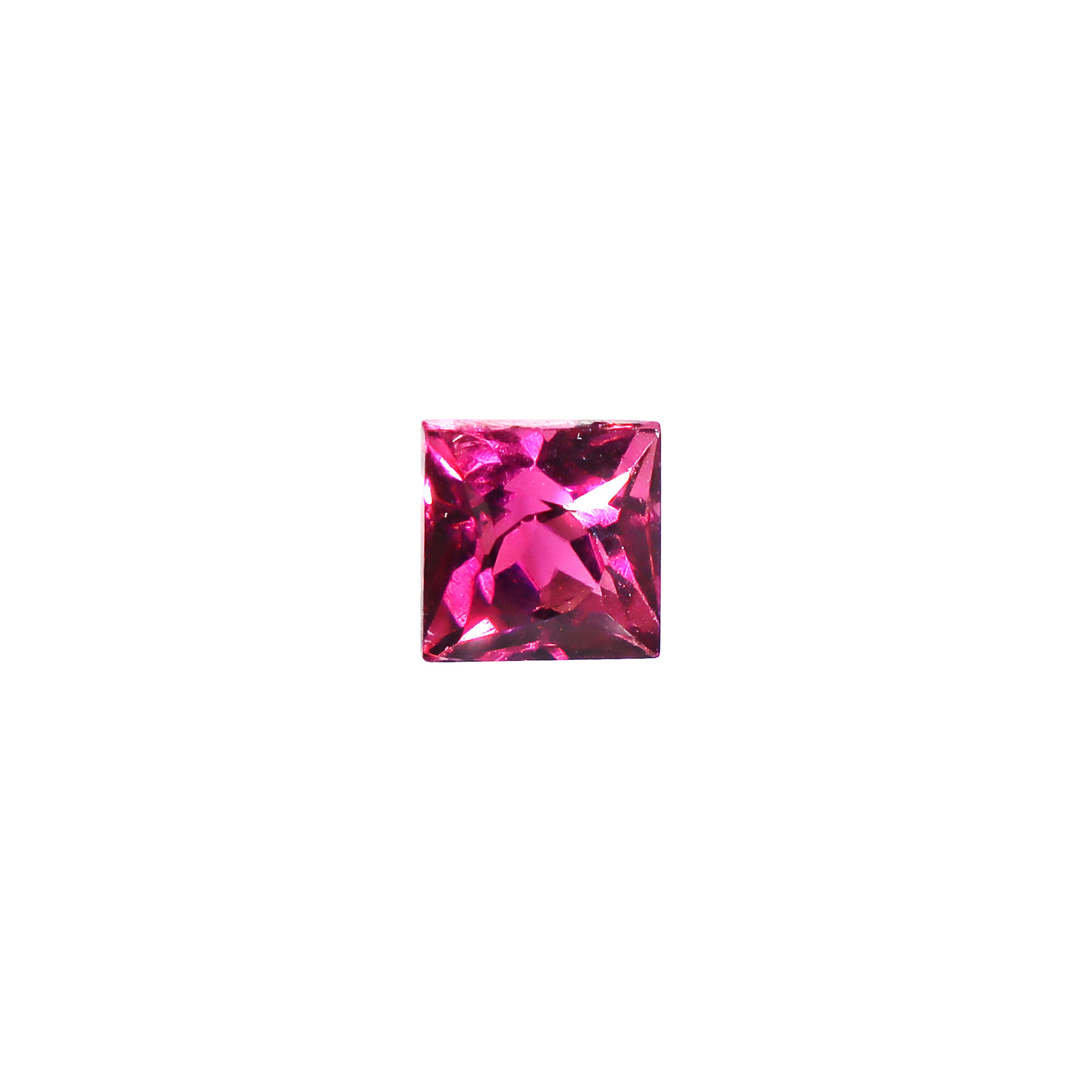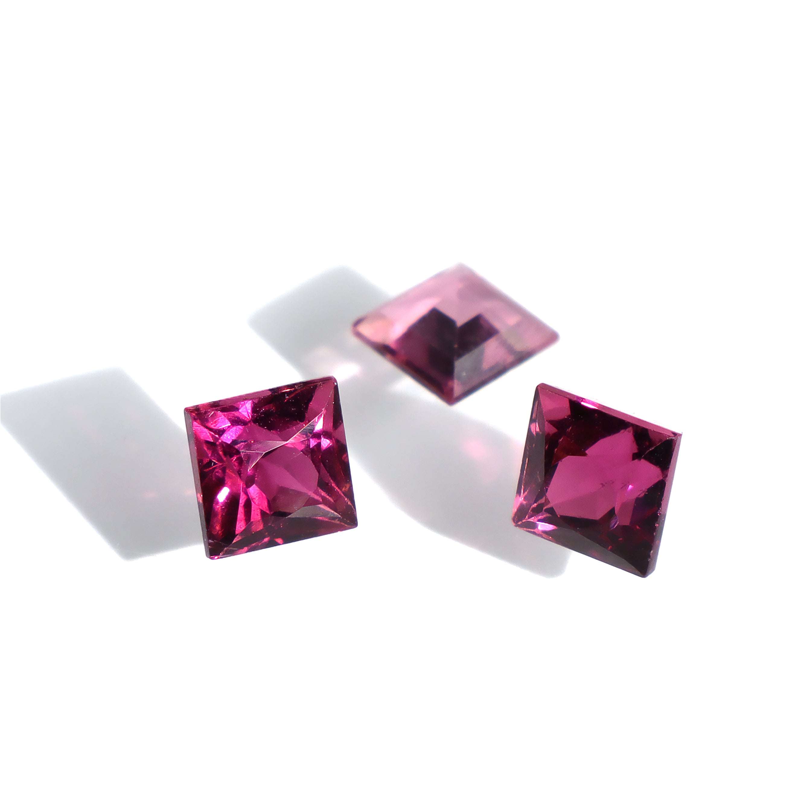 A calibrated selection of square faceted natural pink tourmaline gemstones. As tourmaline stones vary dramatically in terms of the exact shade, all of our stones can range between a deep, rhodalite-like purple-red to a light and bright classic pink colour.