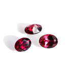 A calibrated selection of oval faceted rhodalite garnet gemstones, all displaying shades of deep and vivid purple-reds and magentas. Perfect for use in bespoke designs and fine jewellery.