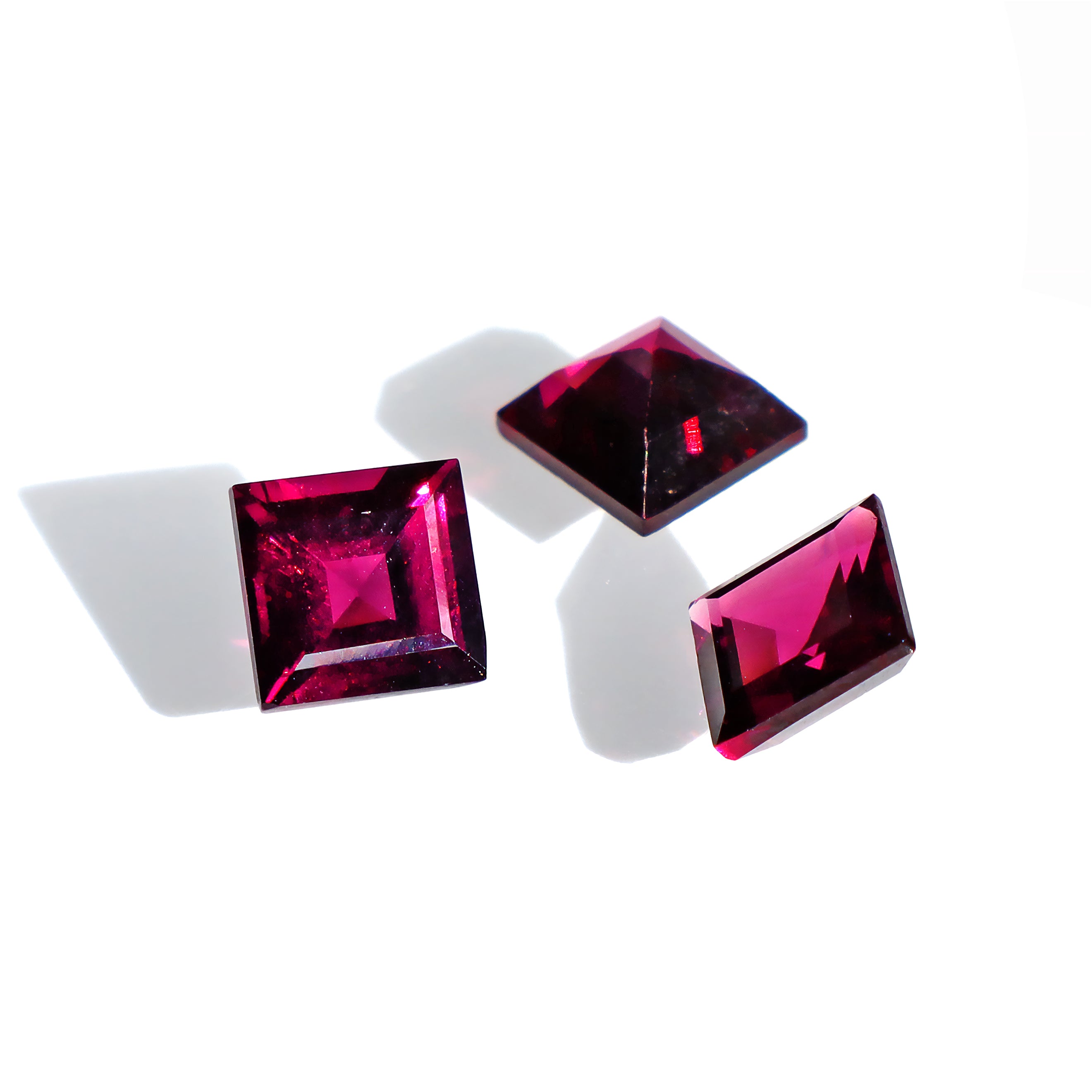 A calibrated selection of square faceted rhodalite garnet gemstones, all displaying shades of deep and vivid purple-reds and magentas. Perfect for use in bespoke designs and fine jewellery.
