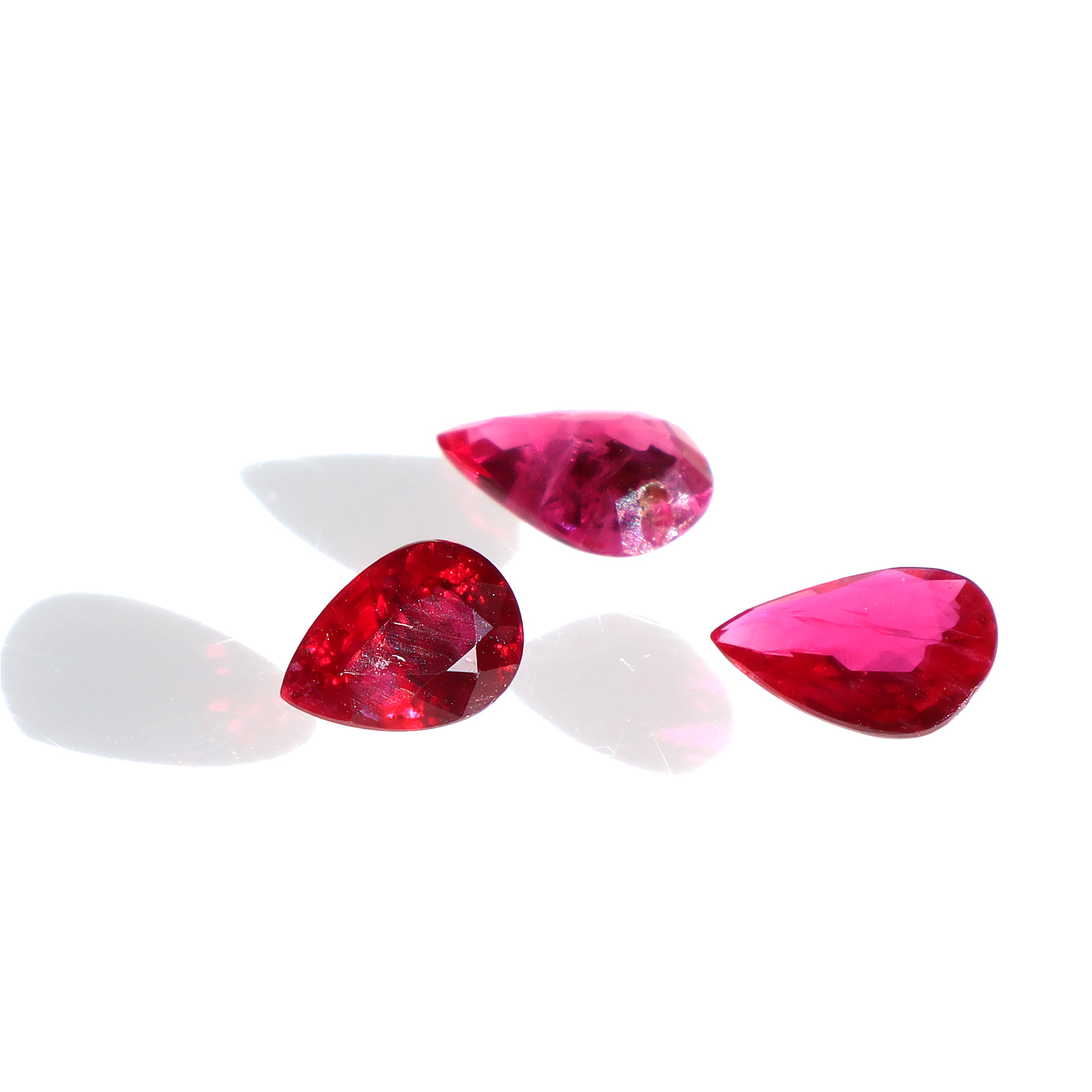 A calibrated selection of pear faceted commercial-quality ruby gemstones. Perfect for use in bespoke designs and fine jewellery.