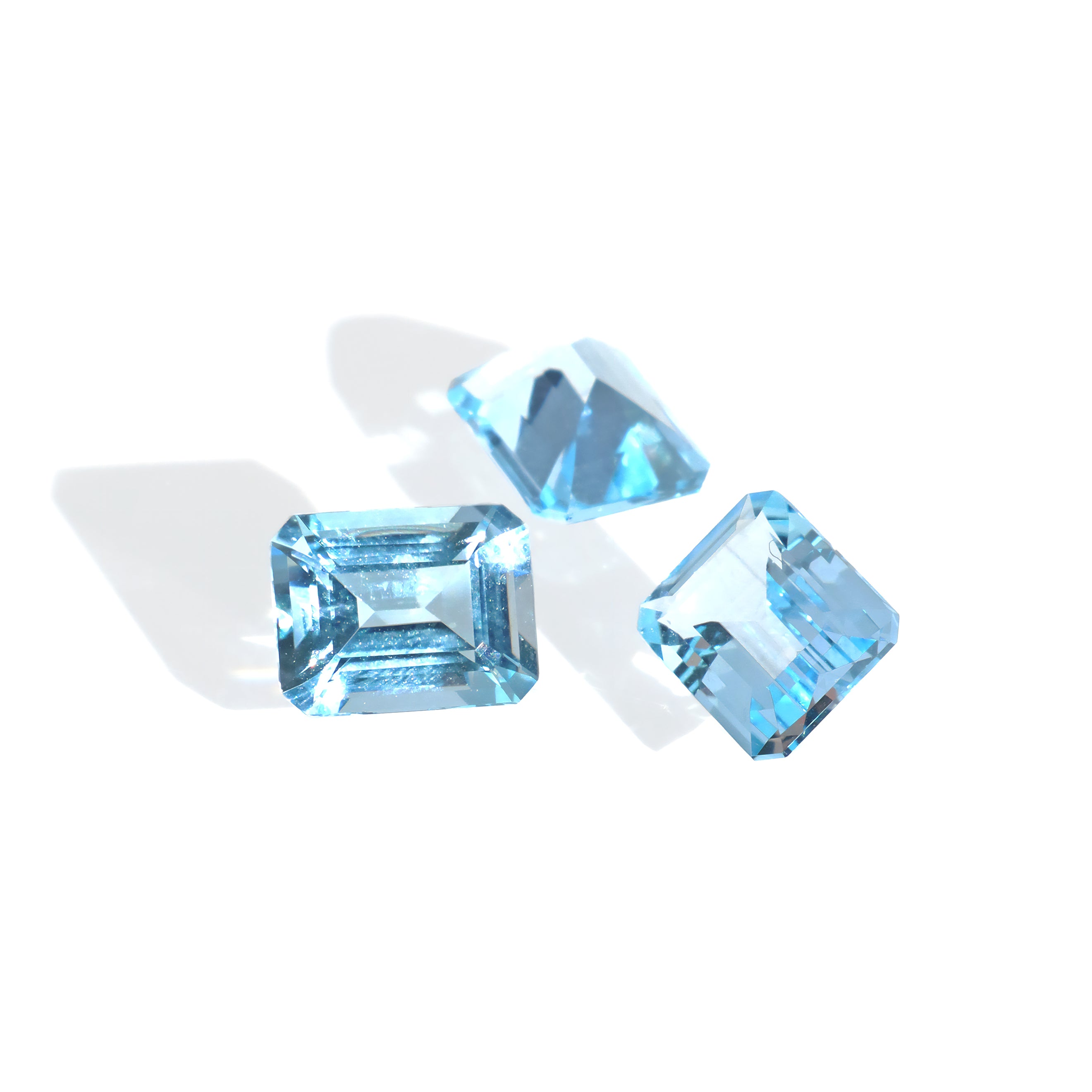 A calibrated selection of octagonal faceted Sky blue topaz gemstones, all possessing a light, sky-blue hue. Perfect for use in bespoke designs and fine jewellery.