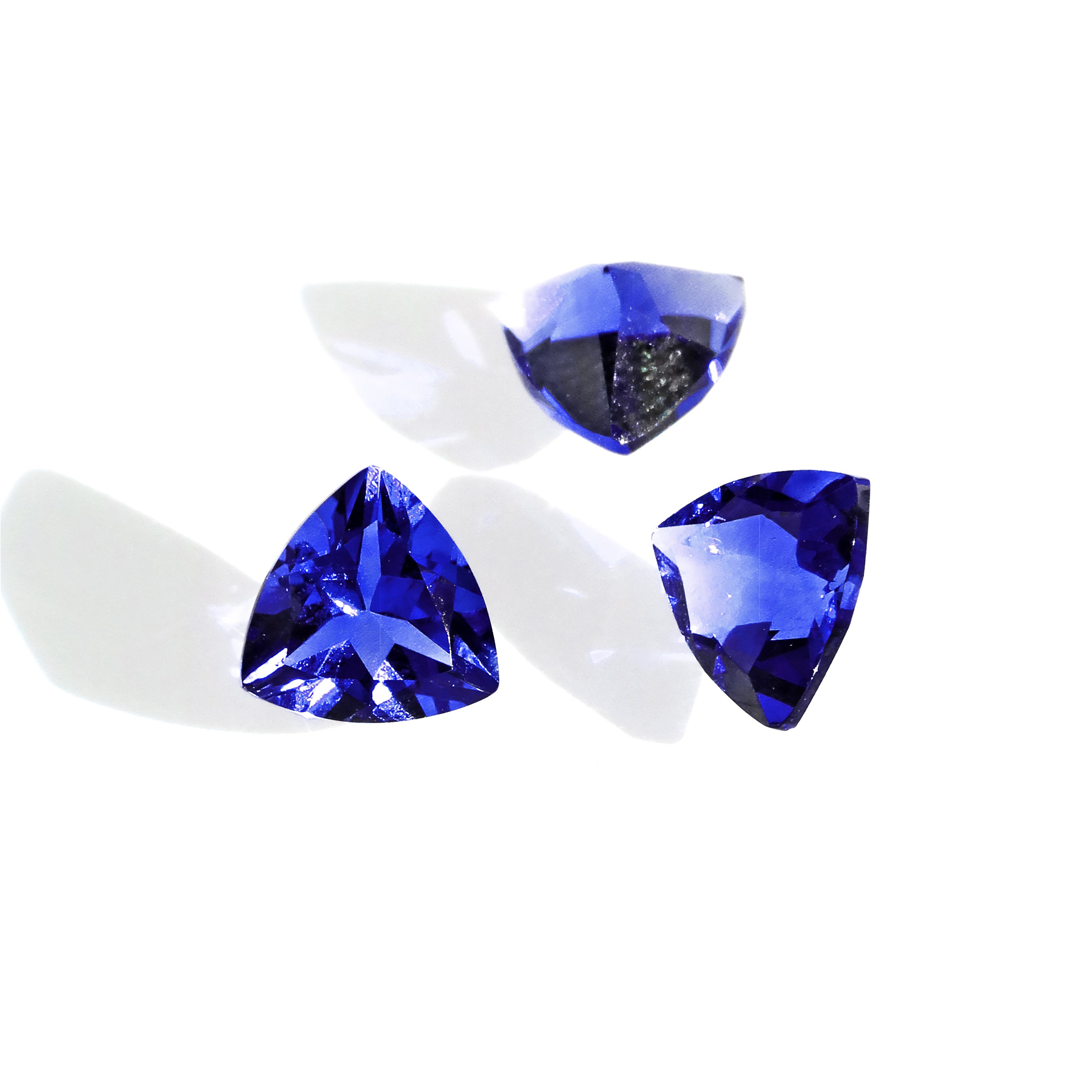 A calibrated selection of trilliant faceted natural tanzanite gemstones, sourced directly from the mountains of Tanzania. Perfect for use in bespoke designs and fine jewellery.