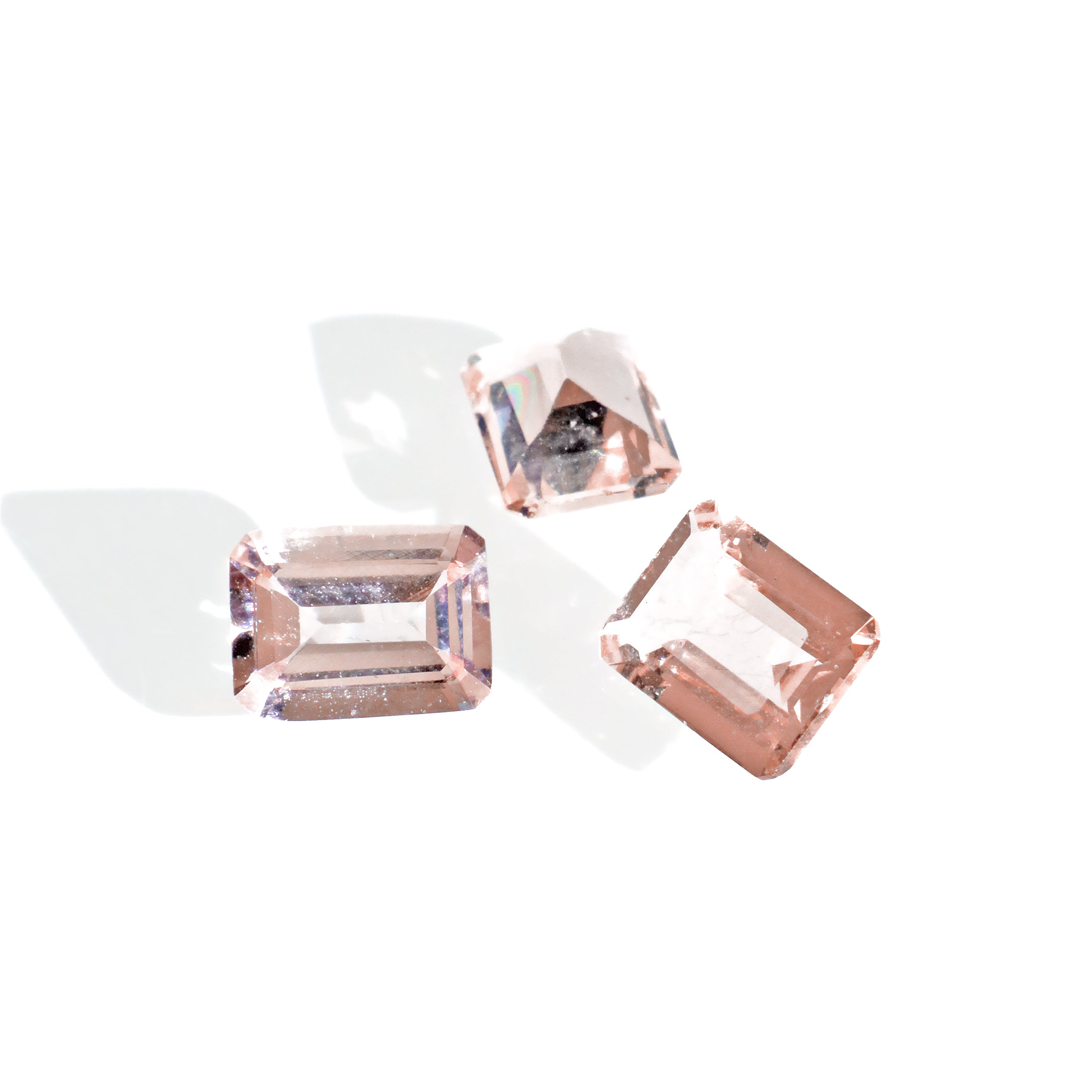 A calibrated selection of octagonal faceted natural morganite jewels, featuring soft and feminine shades of baby and peachy pinks. Perfect for use in bespoke designs and fine jewellery.